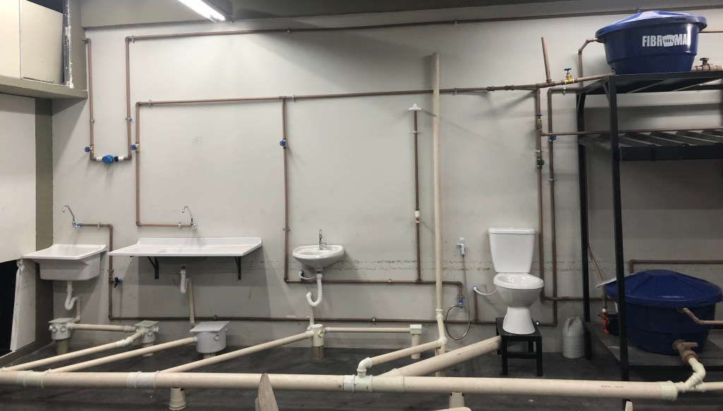 Destacam-se no LABHIDRO/UERJ às Instalações Hidráulicas Prediais de Água Fria, desde a implantação do projeto de alimentação, reservação, recalque, tratamento e distribuição aos pontos de consumo, de maneira simulada, bem como da operação de um sistemas de aproveitamento de águas pluviais, a partir de chuva induzida, em escala laboratorial.